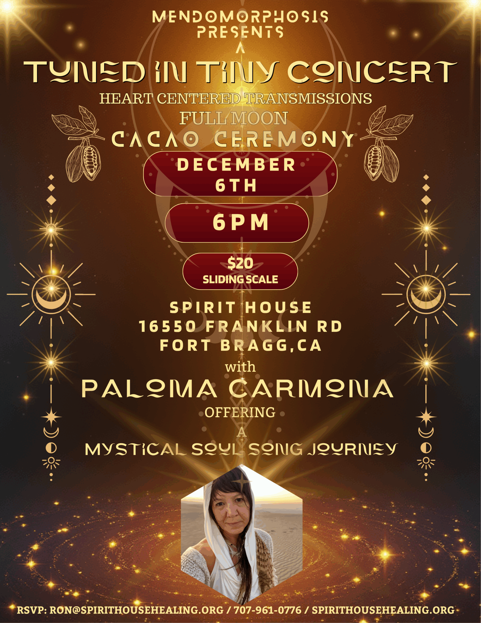 MYSTICAL SOUL SONG JOURNEY Heart Centered Transmissions offered by: PALOMA CARMONA December 6th~ 2025 In the Yurt at Spirit House Center 6:00 p.m. Relax Enjoy Imagine Heal
